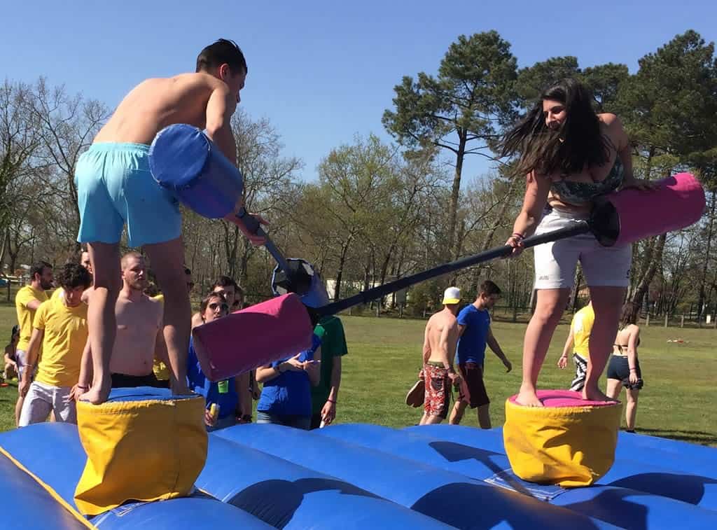 Le jeu des joutes gonflables est vraiment fun ! Il se joue à deux. Les joueurs sont en équilibre sur un petit pot qui n’est pas très stable et qui tourne sur lui même. Ils sont équipés d’une sorte de coton tige géant (de 2 mètres). Le but est de faire tomber son adversaire sans tomber bien sûr. Vous pourrez utiliser votre « coton tige géant » pour le poussez , lui donner des coups ou parrer ses attaques sans perdre l’équilibre. Un immense matelas est ici pour amortir les chutes. Le jeu des joutes fait partie des location d’animations gonflables adaptées à tous : hommes, femmes aux ados et même aux enfants dès 7 ans environ.